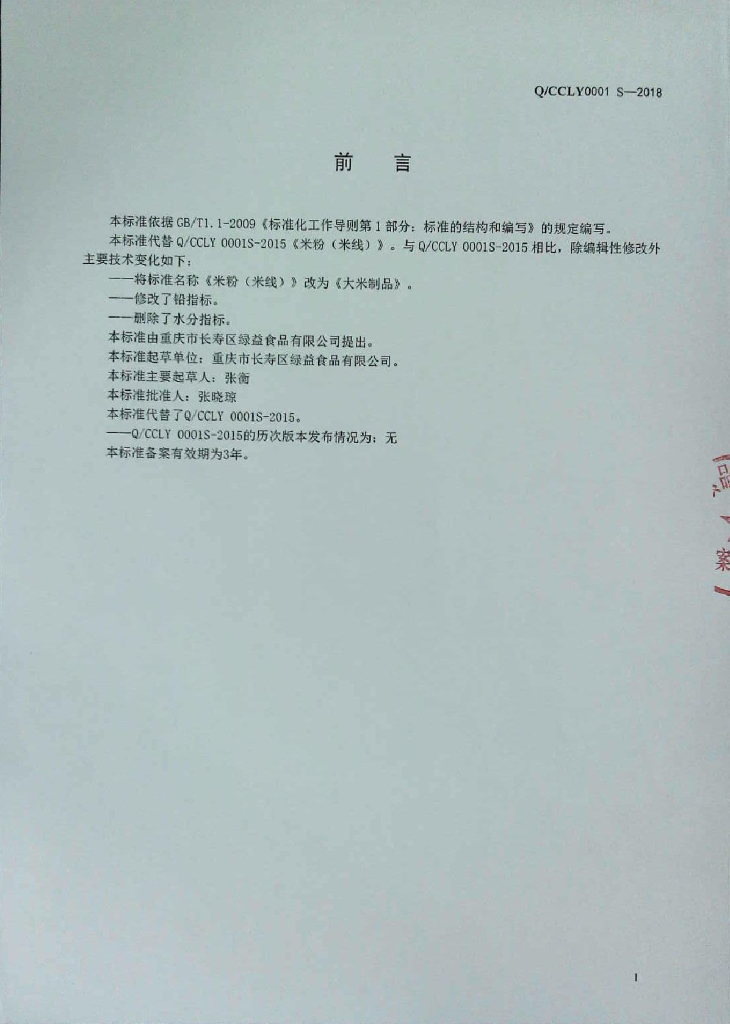 Q/CCLY 0001S-2018 大米制品