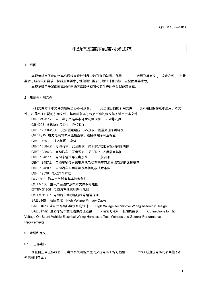 Q/TEV 157-2014 电动汽车高压线束技术规范