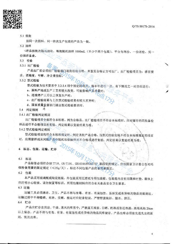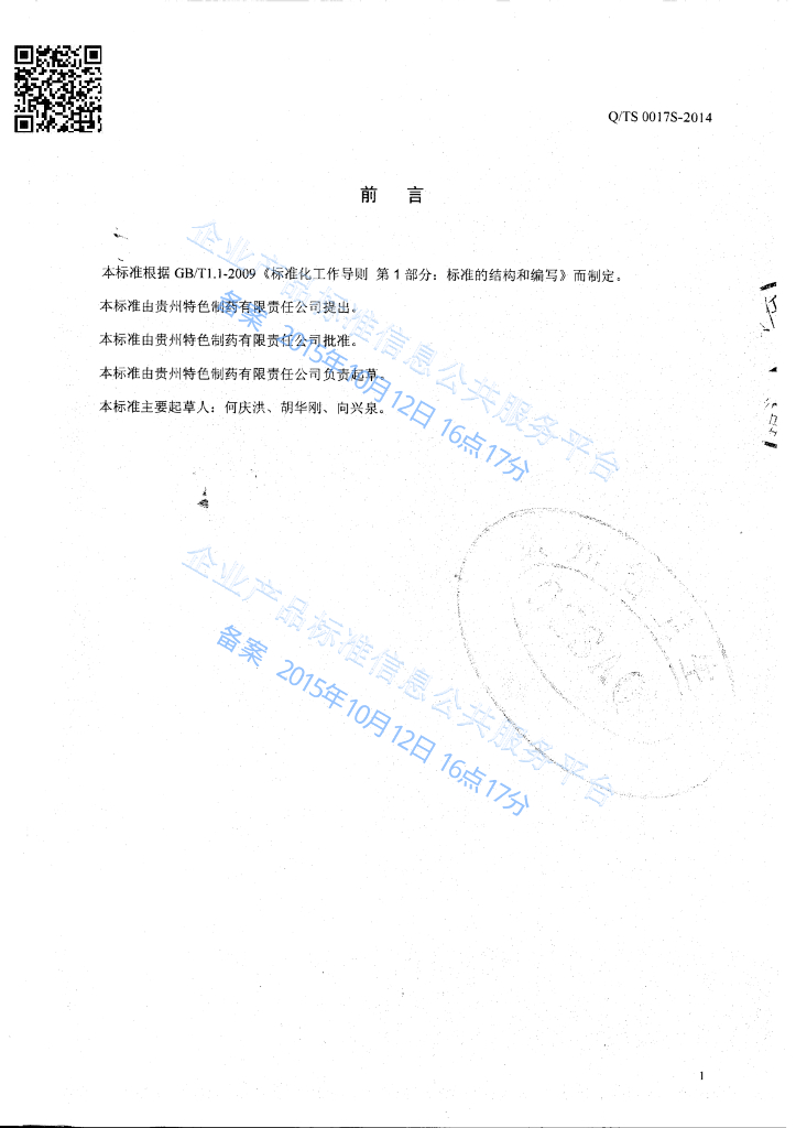 Q/TS 0017S-2014 贵州特色制药有限责任公司 弯腰酒(配制酒)