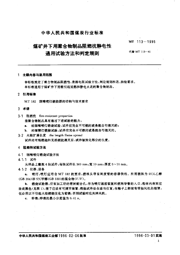 MT 113-1995 煤矿井下用聚合物制品阻燃抗静电性通用试验方法和判定规则