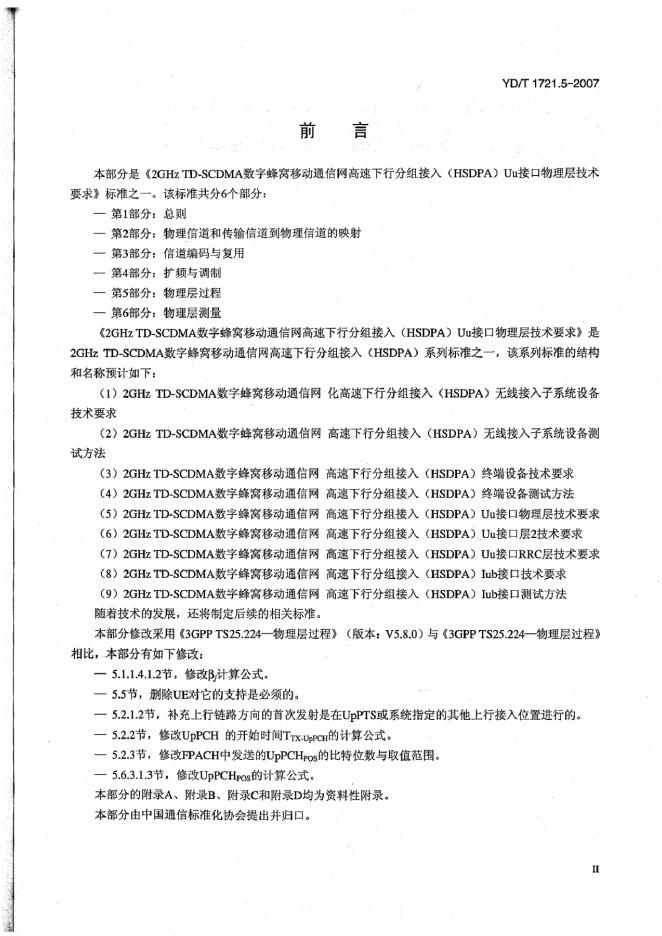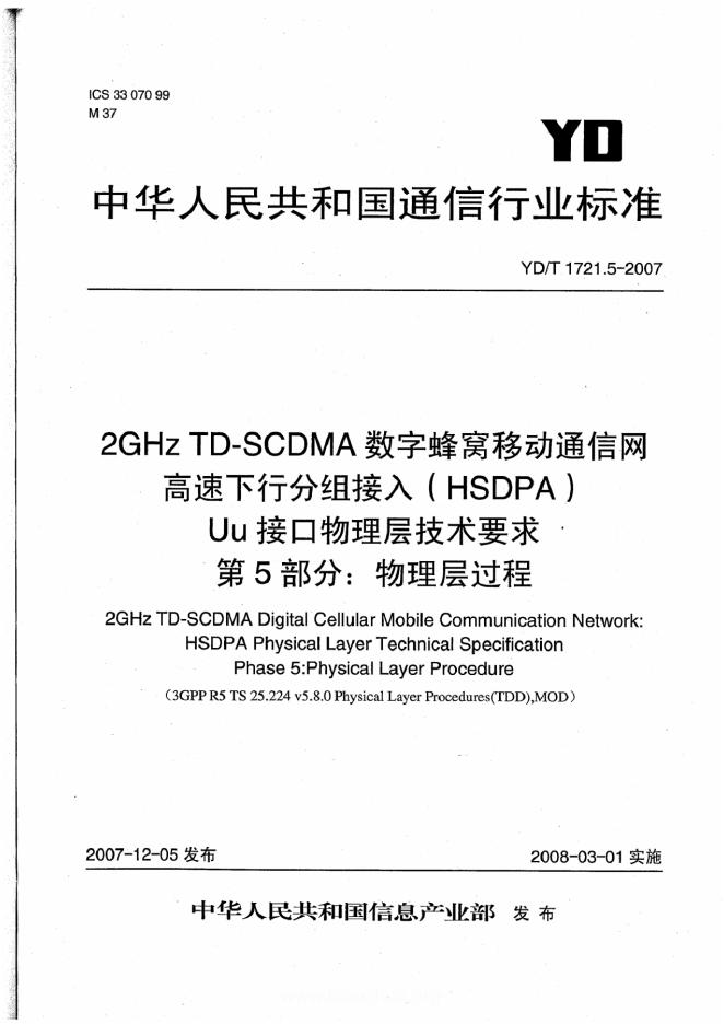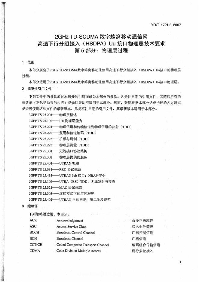 YD/T 1721.5-2007 2GHz TD-SCDMA数字蜂窝移动通信网 高速下行分组接入(HSDPA)Uu接口物理层技术要求 第5部分:物理层过程