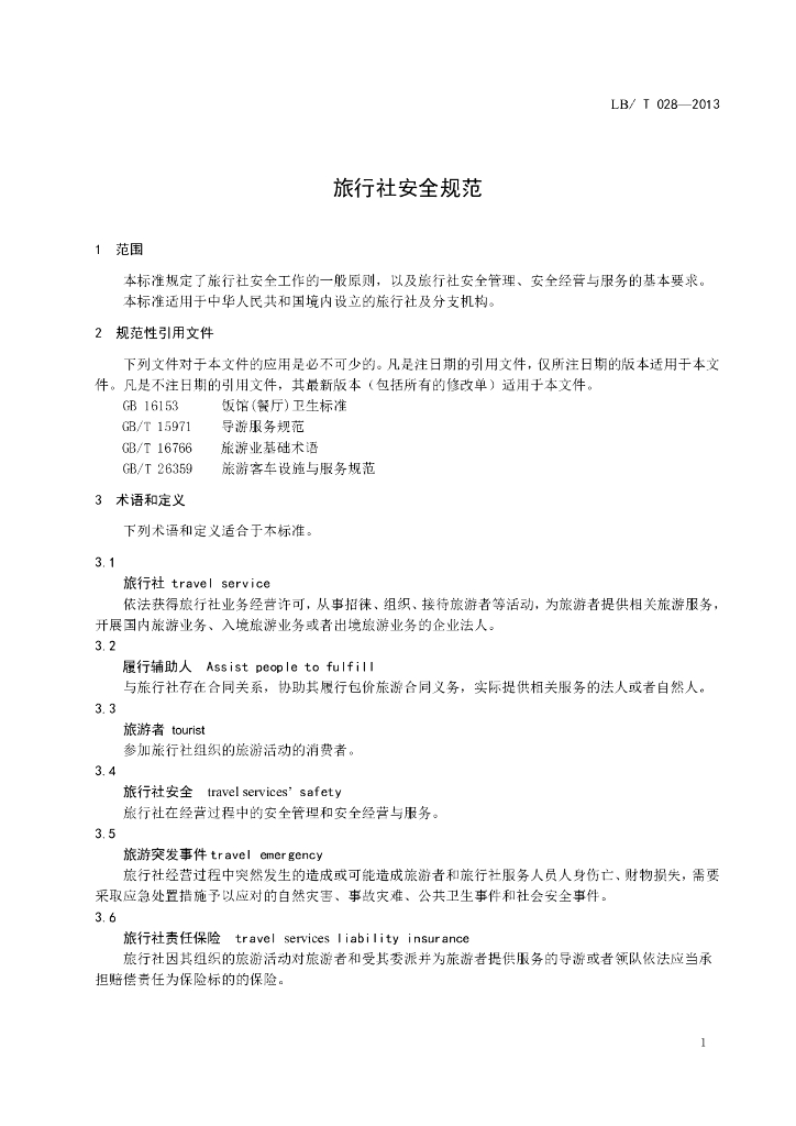 LB/T 028-2013 旅行社安全规范