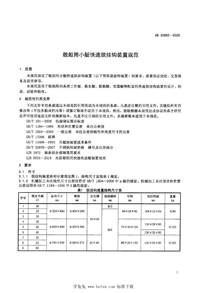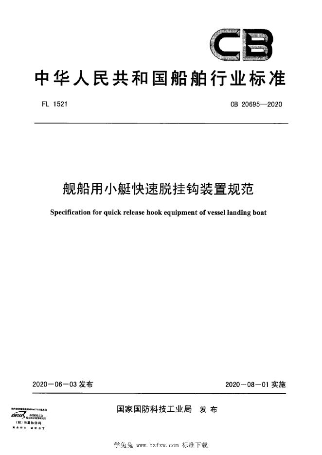 CB 20695-2020 舰船用小艇快速脱挂钩装置规范