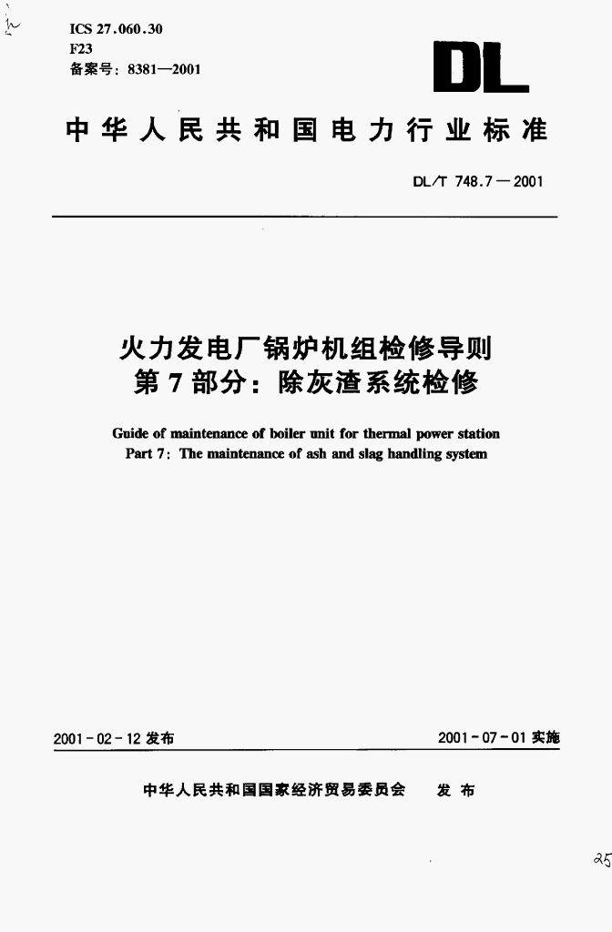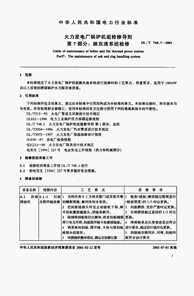 DL/T 748.7-2001 火力发电厂锅炉机组检修导则 第7部分:除灰渣系统检修