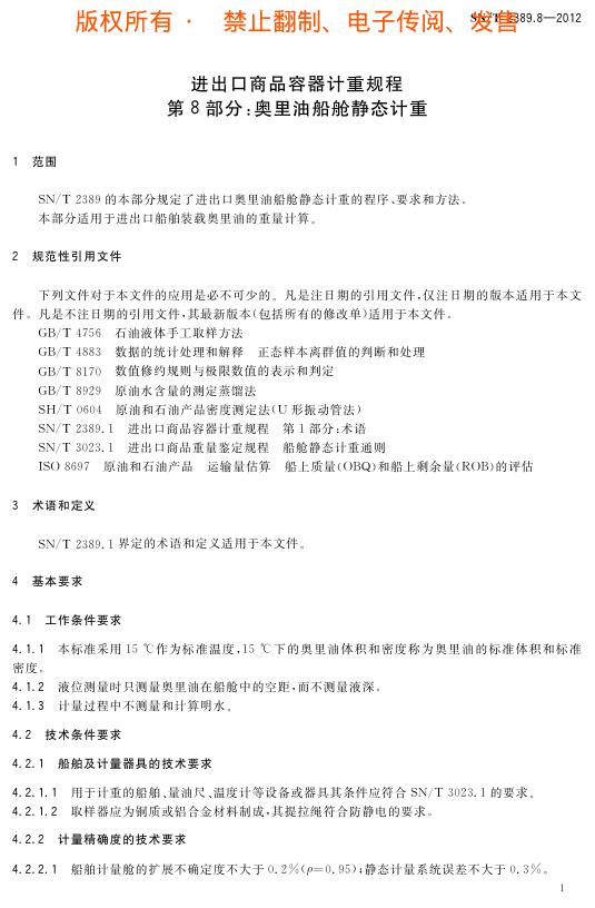 SN/T 2389.8-2012 进出口商品容器计重规程 第8部分:奥里油船舱静态计重