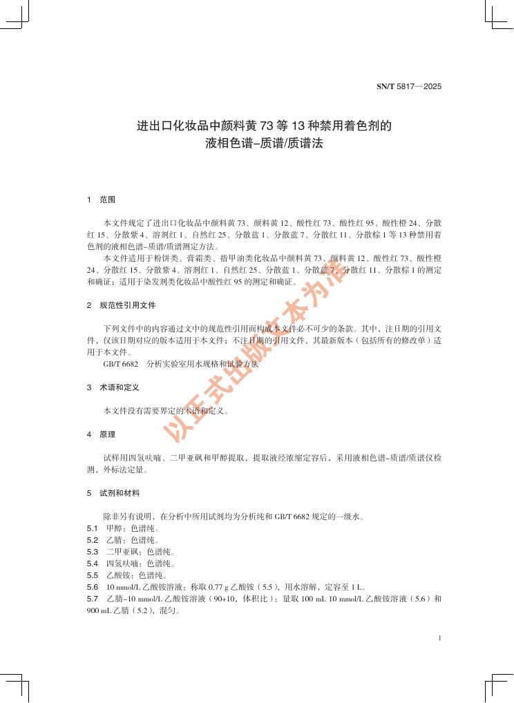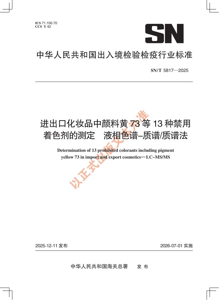 SN/T 5817-2025 进出口化妆品中颜料黄73等13种禁用着色剂的测定 液相色谱-质谱/质谱法