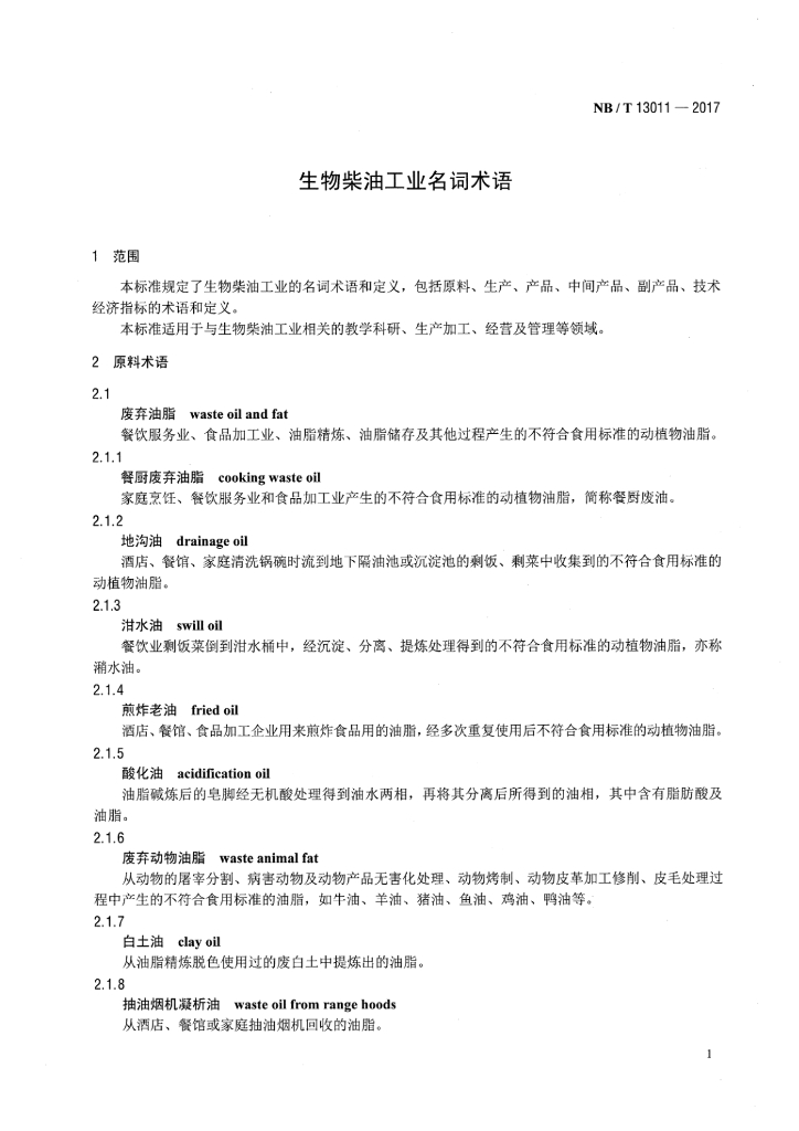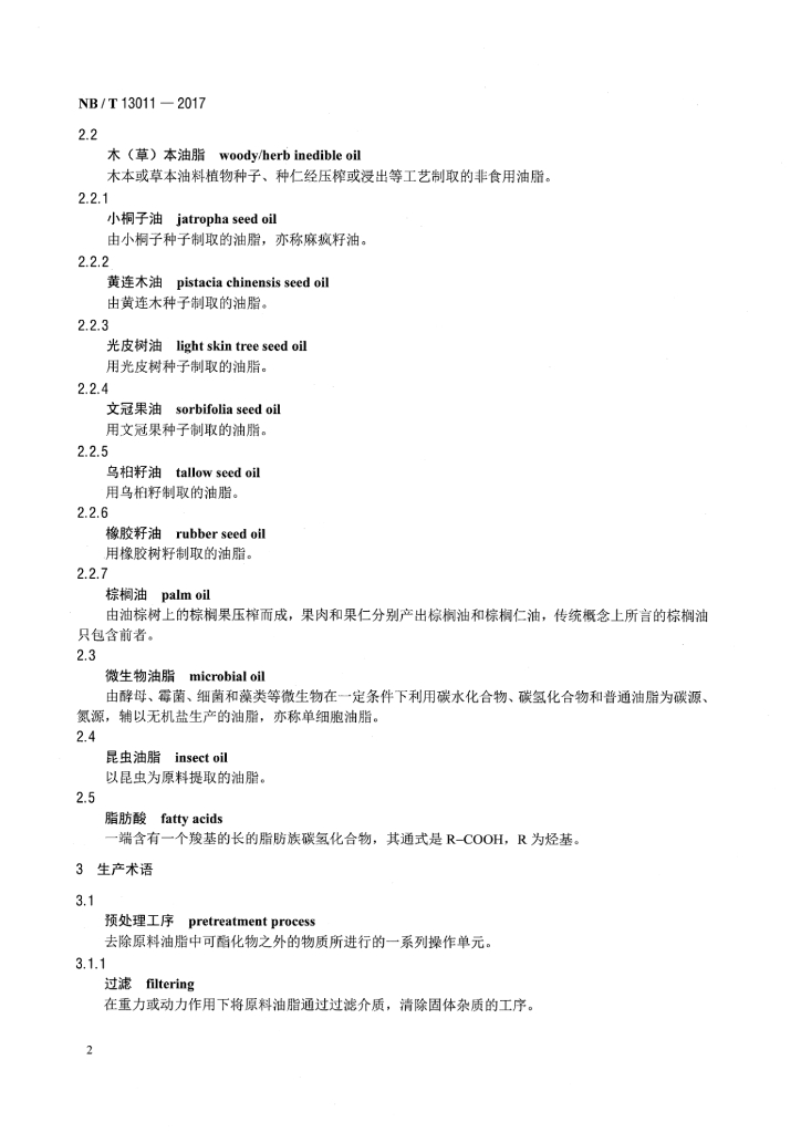 NB/T 13011-2017 生物柴油工业名词术语