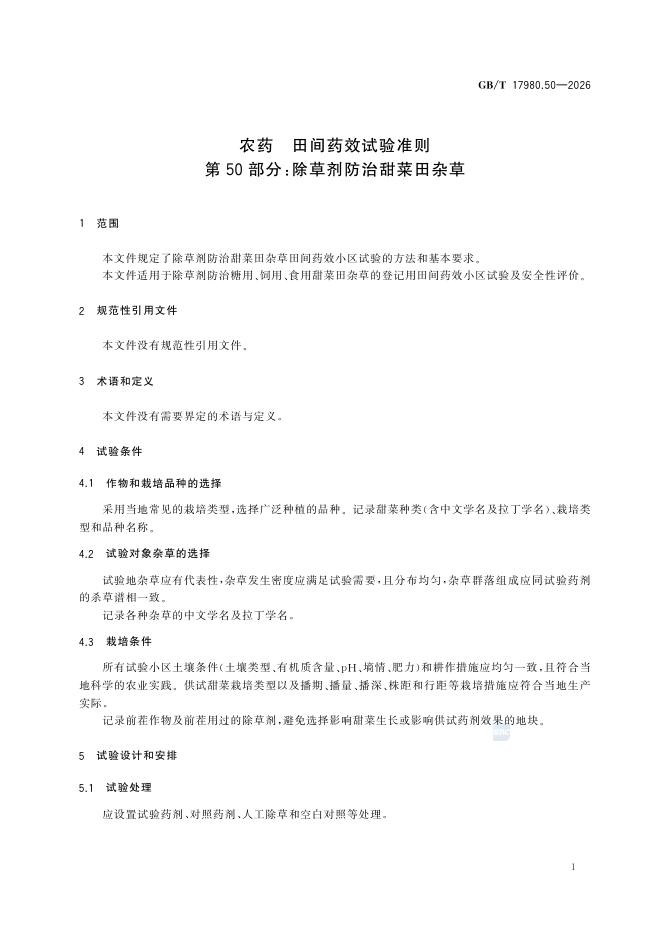GB/T 17980.50-2026 农药 田间药效试验准则 第50部分:除草剂防治甜菜田杂草
