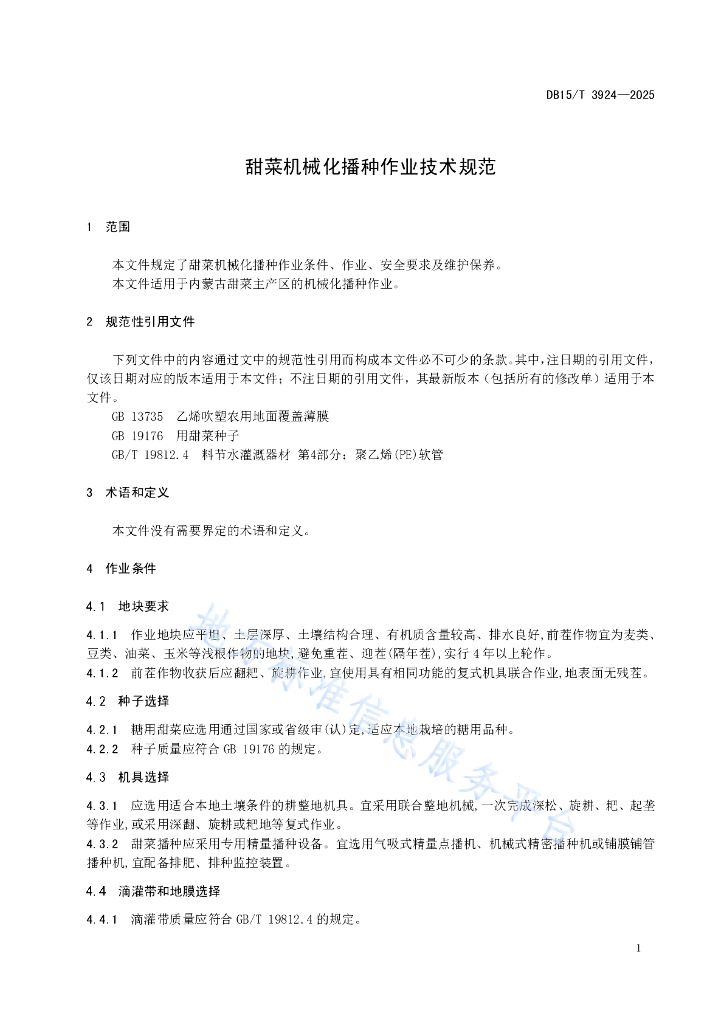 DB15/T 3924-2025 甜菜机械化播种作业技术规范