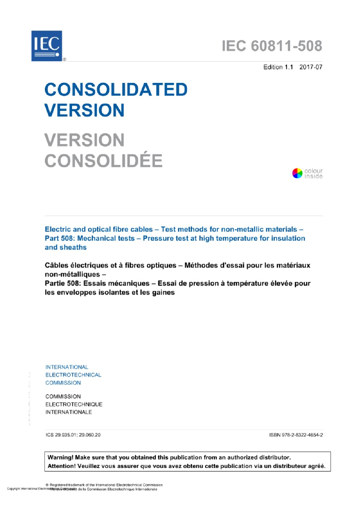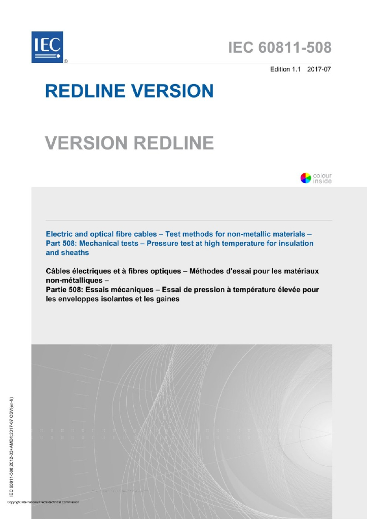 IEC 60811-508:2012+AMD1:2017 电缆和光缆 非金属材料的试验方法 第508部分:机械性能试验 绝缘和护套高温压力试验