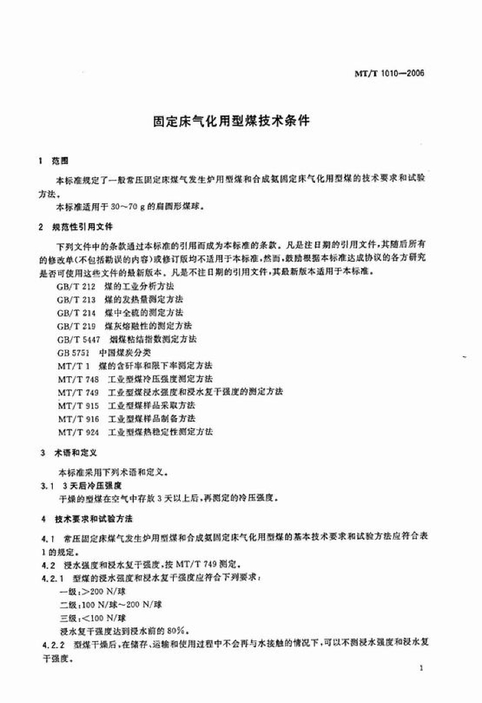 MT/T 1010-2006 固定床气化用型煤技术条件