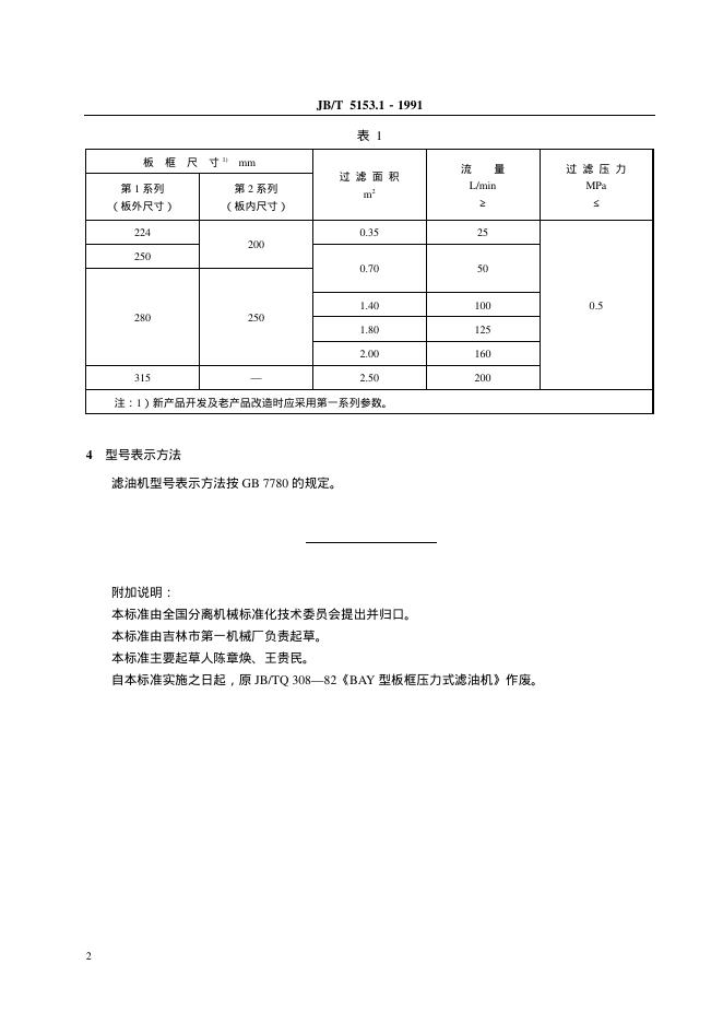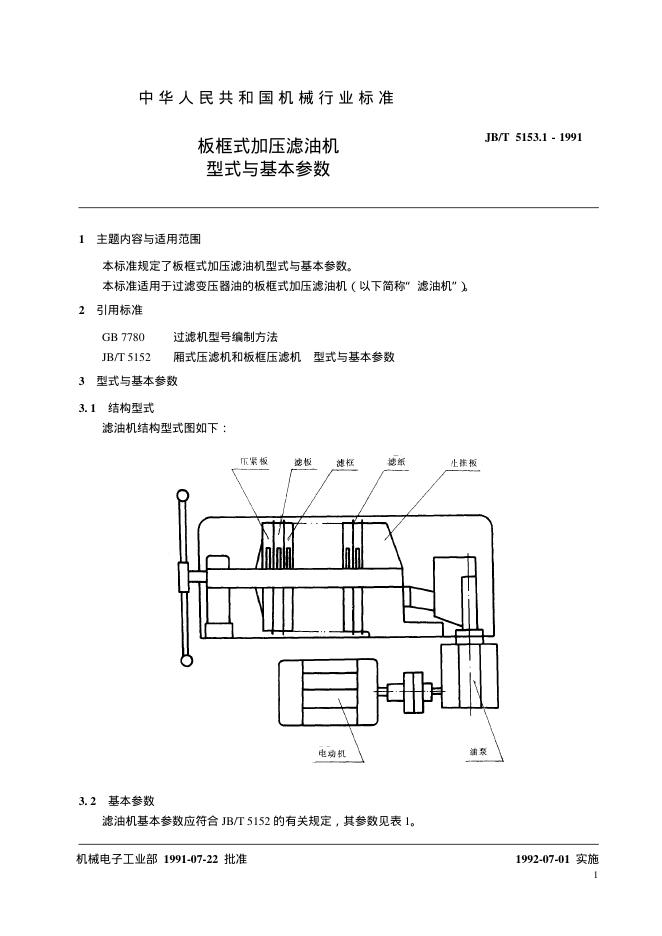 JB/T 5153.1-1991 板框式加压滤油机 型式与基本参数
