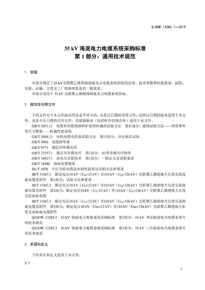 Q/GDW 13284.1-2019 35kV海底电力电缆系统采购标准 第1部分:通用技术规范