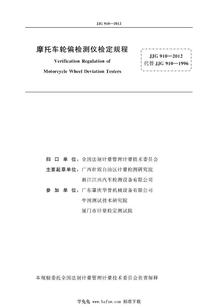 广西壮族自治区计量检测研究院、浙江江兴汽车检测设备有限公司、广东肇庆华誉机械设备有限公司、中国测试技术研究院、厦门市计量检定测试院