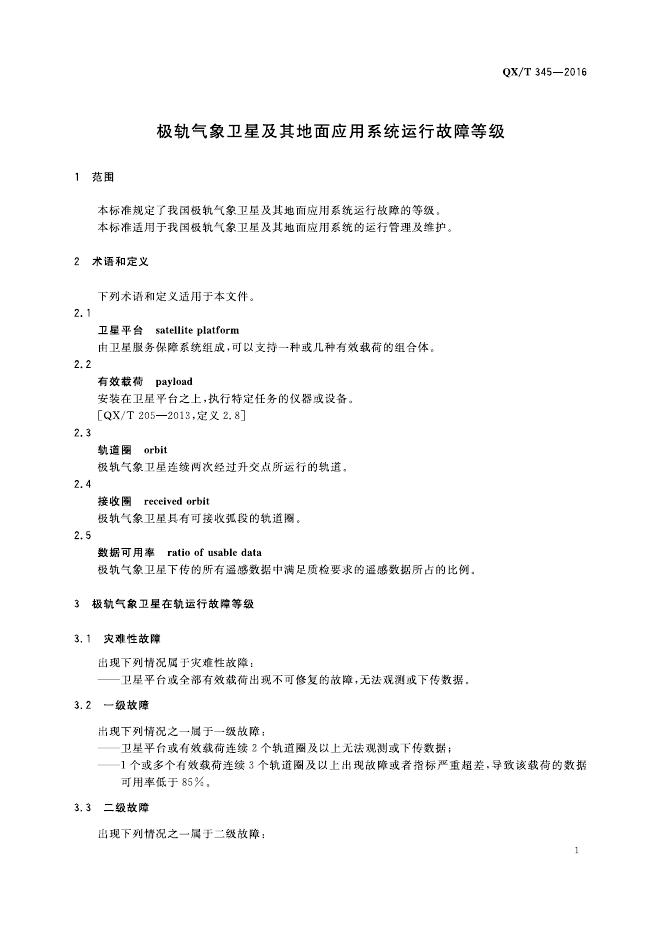 QX/T 345-2016 极轨气象卫星及其地面应用系统运行故障等级