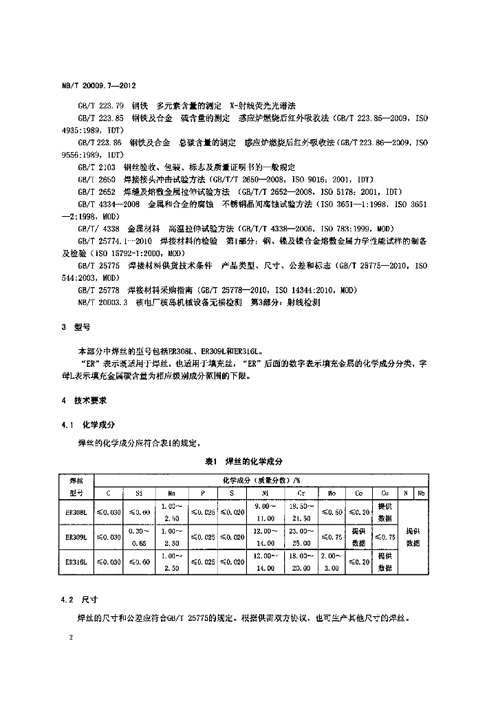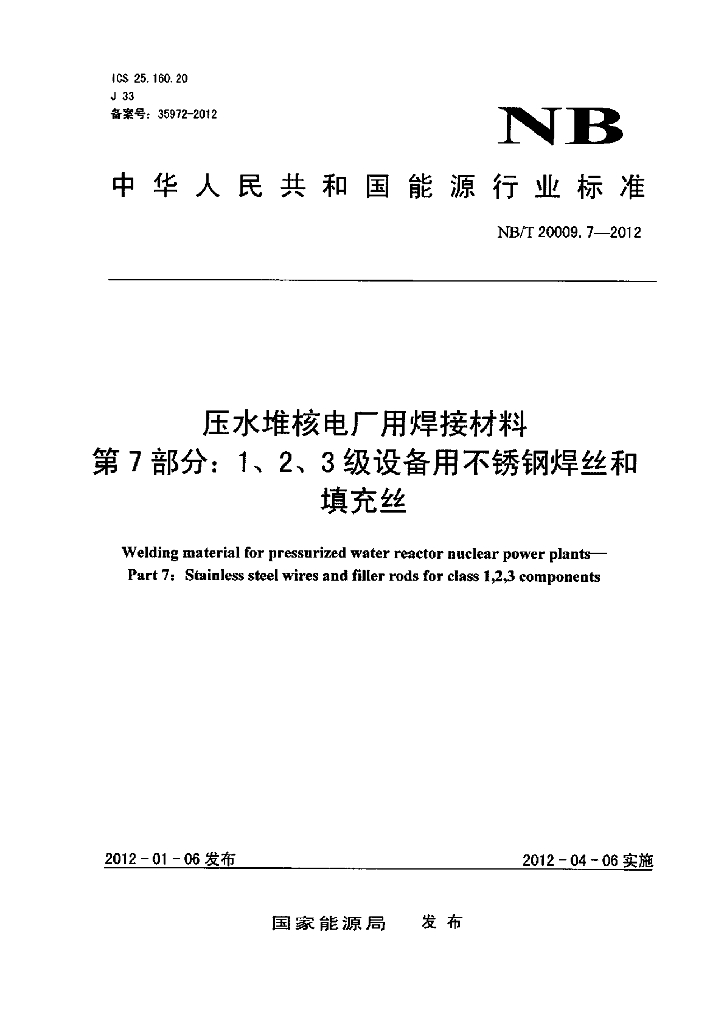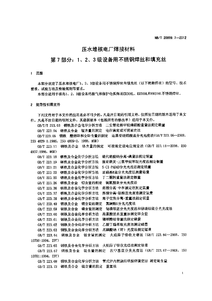 NB/T 20009.7-2012 压水堆核电厂用焊接材料 第7部分:1、2、3级设备用不锈钢焊丝和填充丝