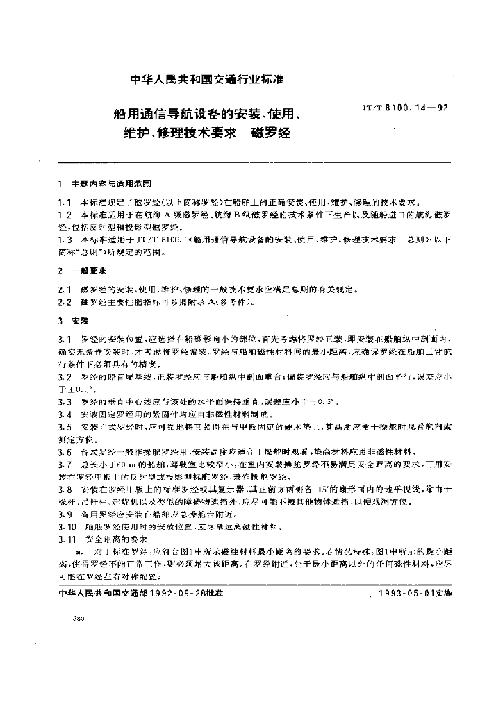 JT/T 8100.14-1992 船用通信导航设备的安装、使用、维护、修理技术要求磁罗经
