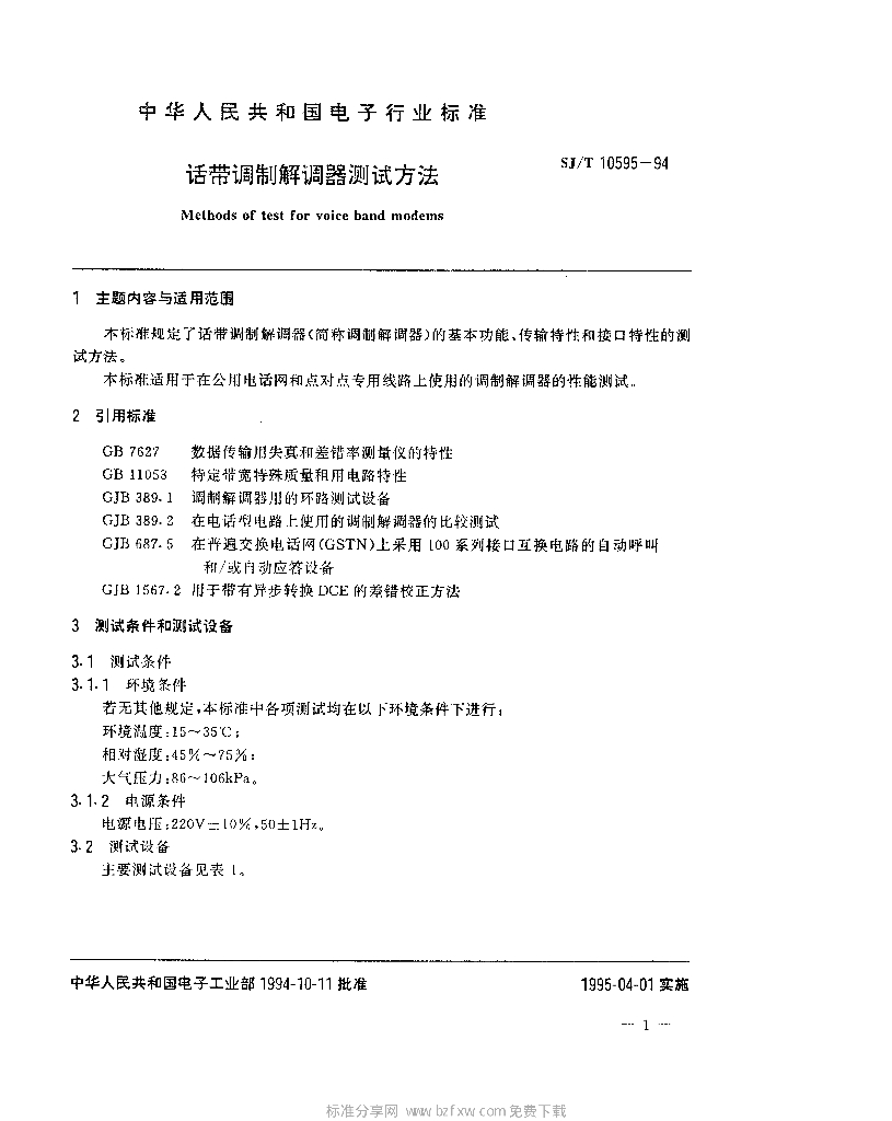 SJ/T 10595-1994 话带调制解调器测试方法