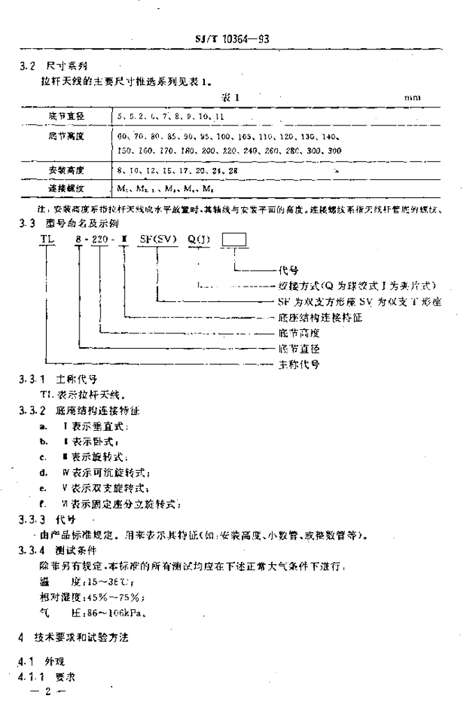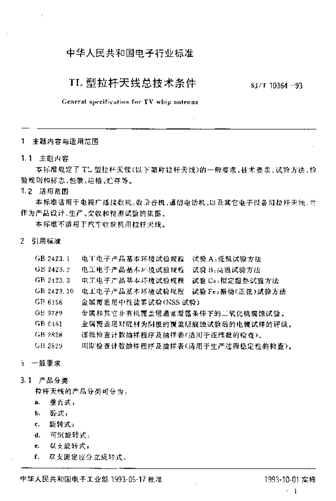 SJ/T 10364-1993 TL型拉杆天线总技术条件