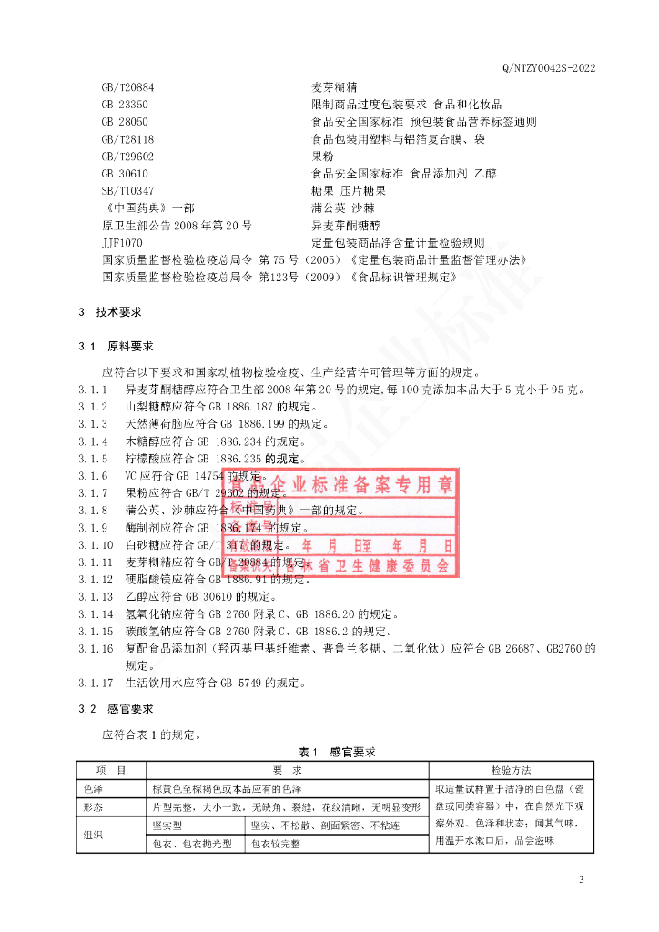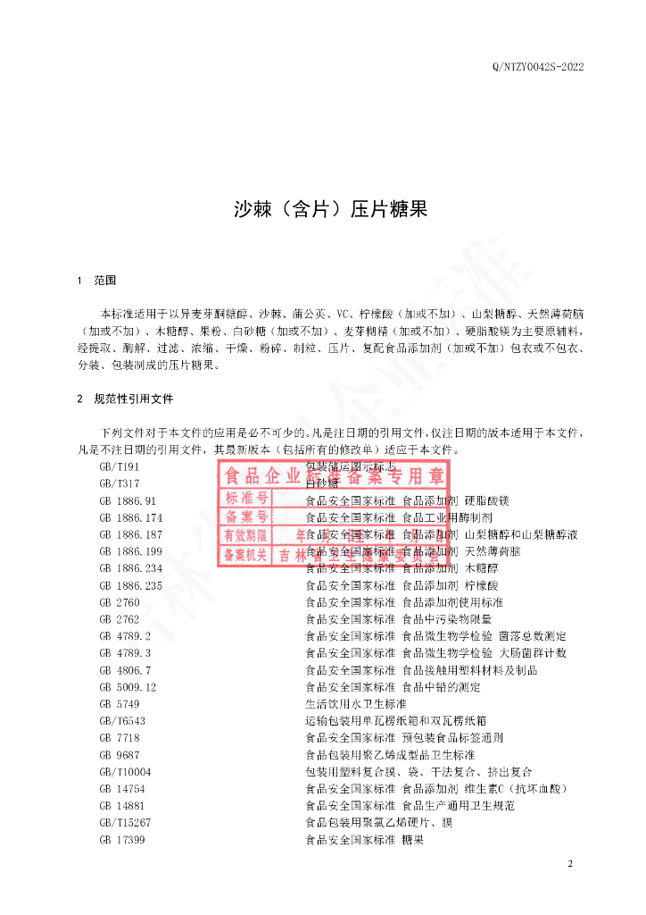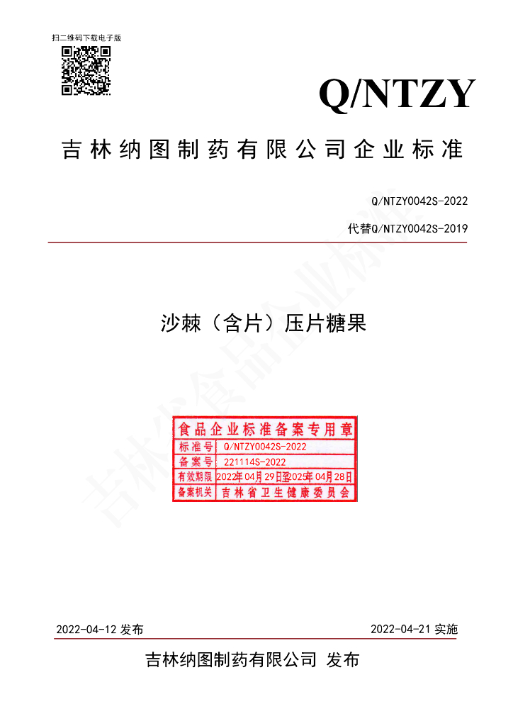 Q/NTZY 0042S-2022 沙棘(含片)压片糖果