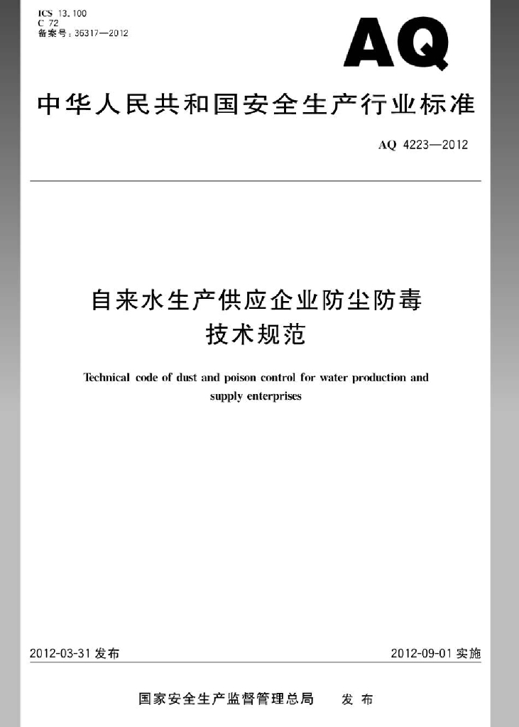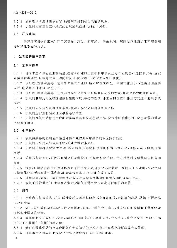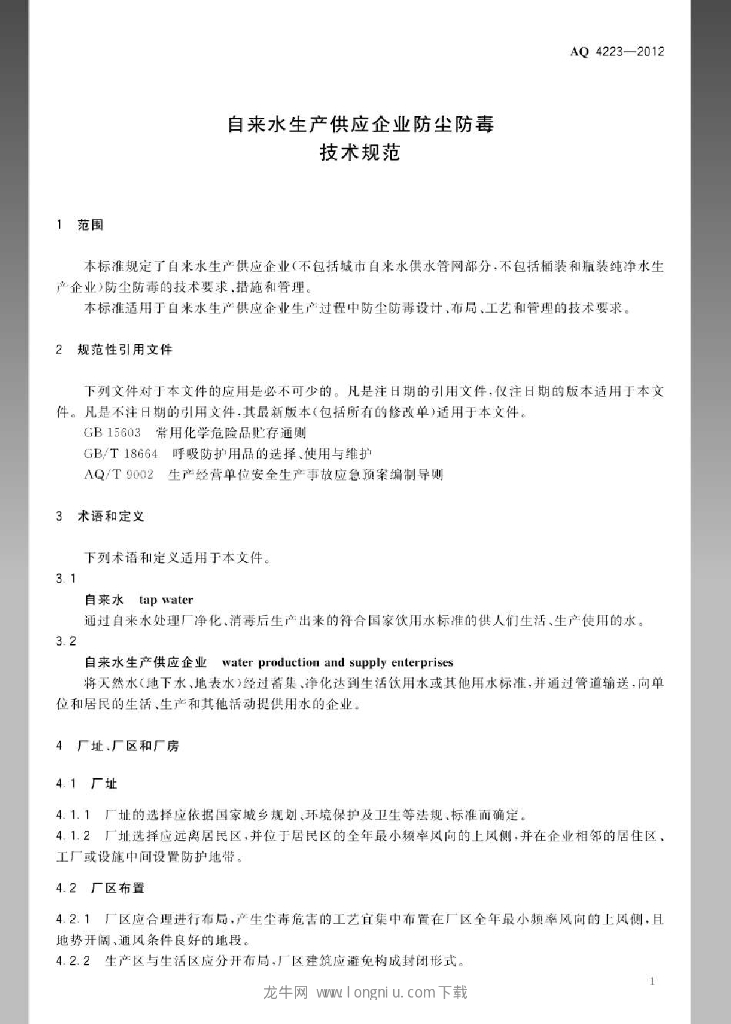 AQ 4223-2012 自来水生产供应企业防尘防毒技术规范