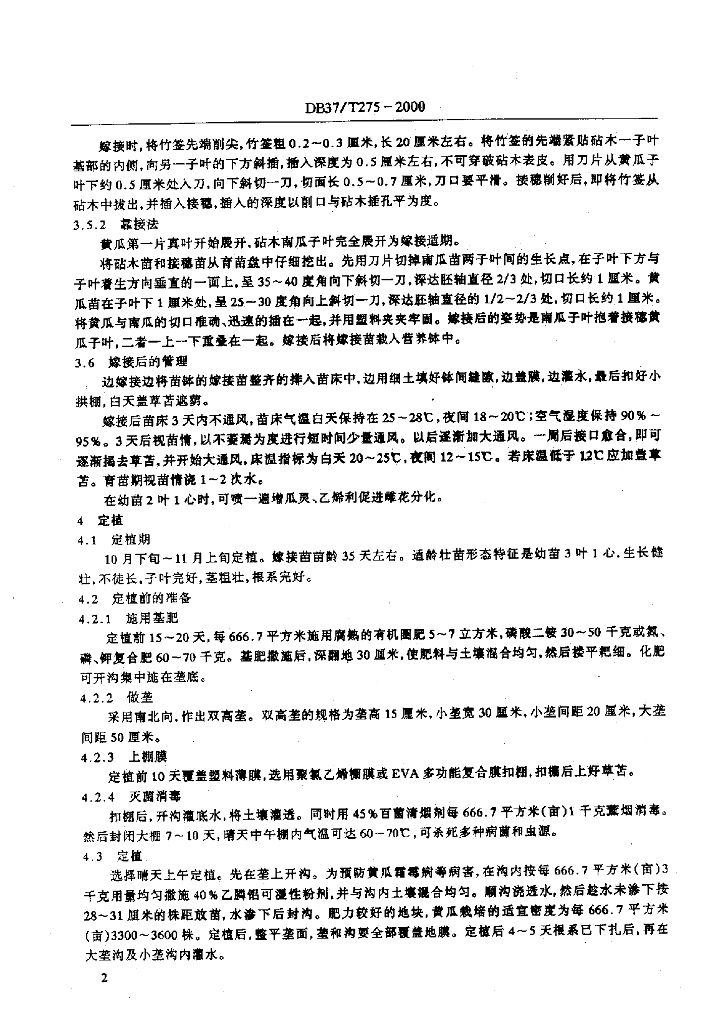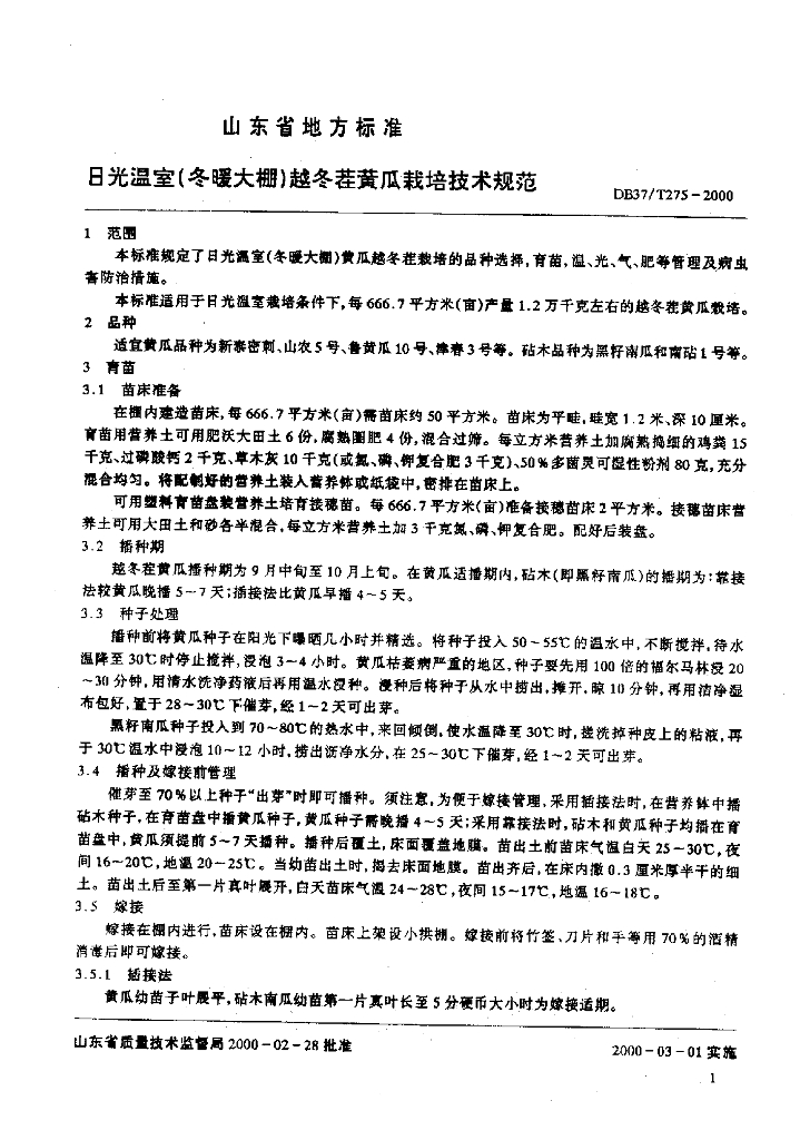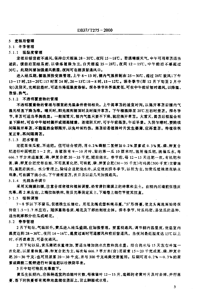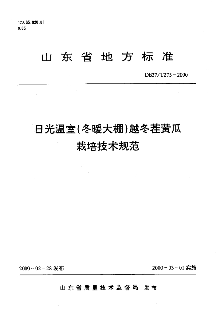DB37/T 275-2000 日光温室(冬暖大棚)越冬茬黄瓜栽培技术规范