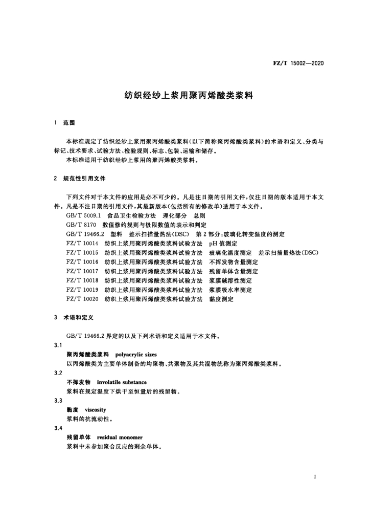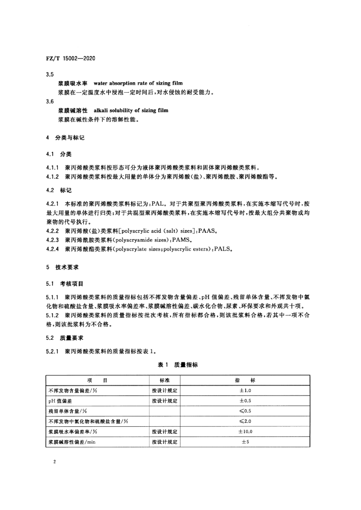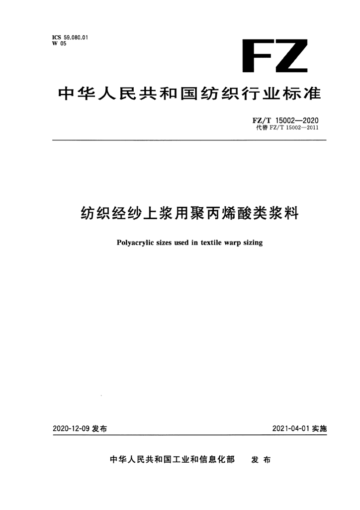FZ/T 15002-2020 纺织经纱上浆用聚丙烯酸类浆料