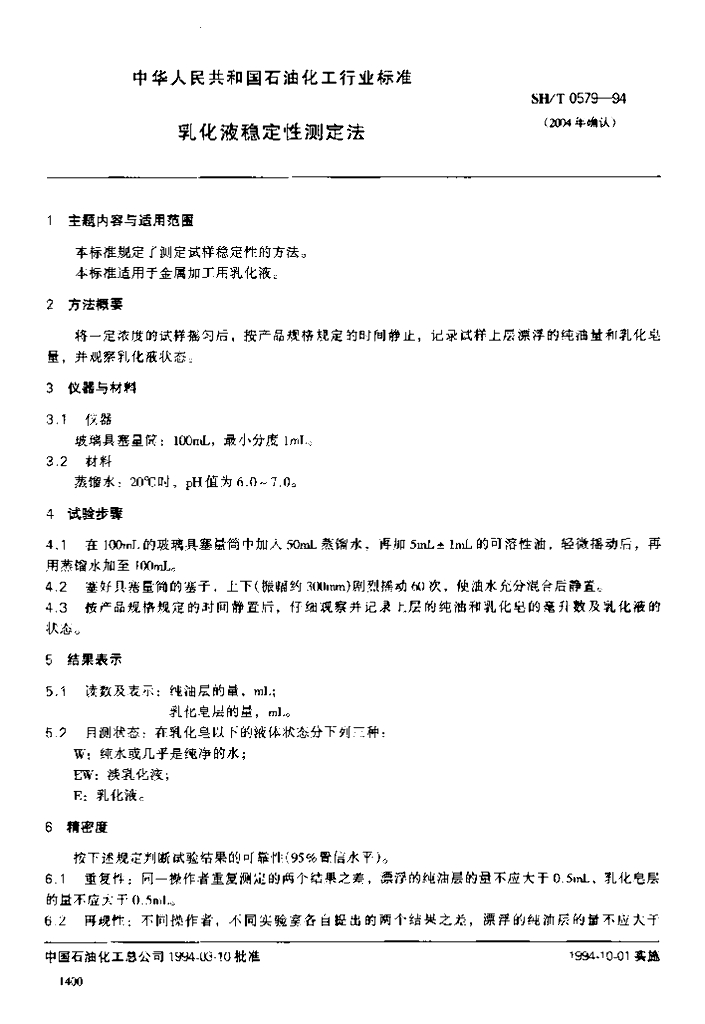 SH/T 0579-1994 乳化液稳定性测定法