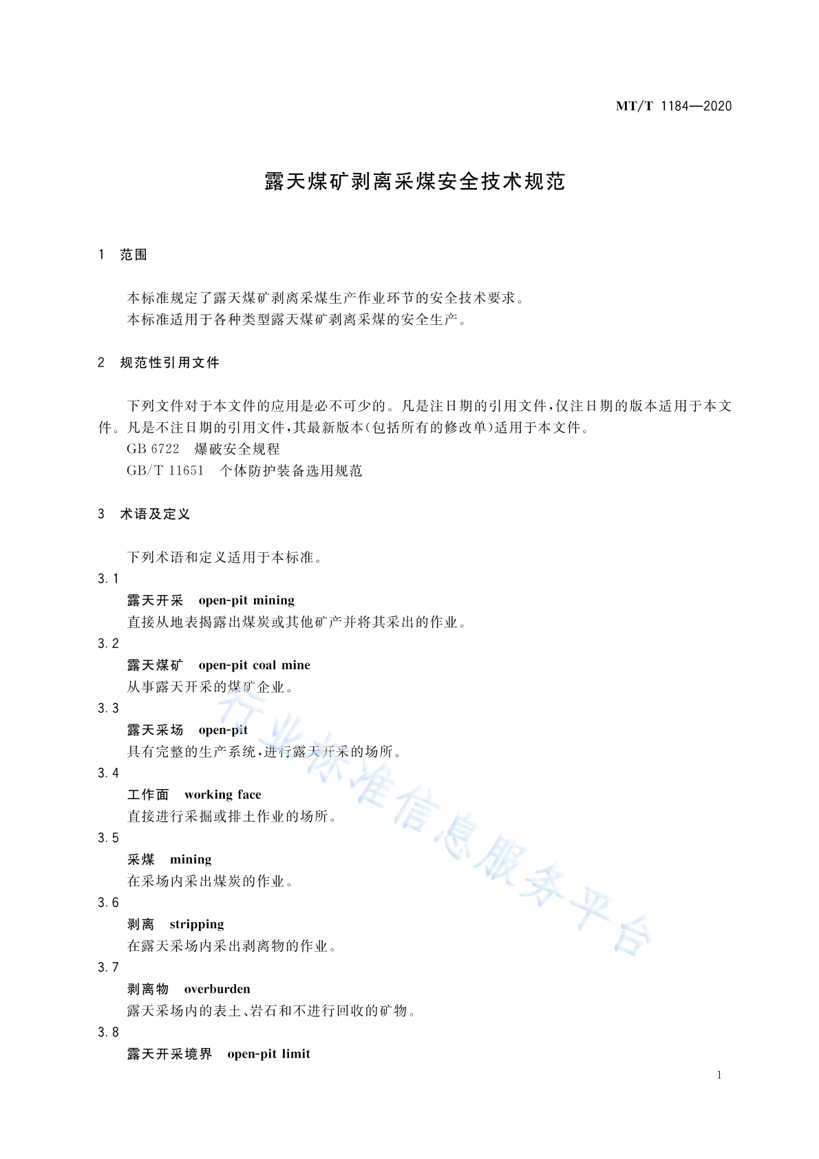 MT/T 1184-2020 露天煤矿剥离采煤安全技术规范
