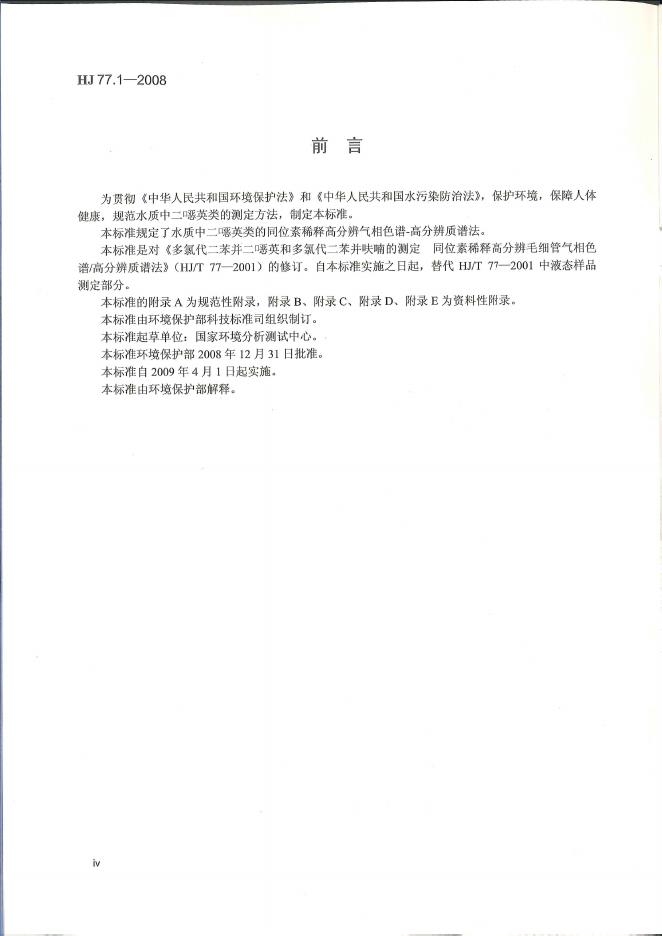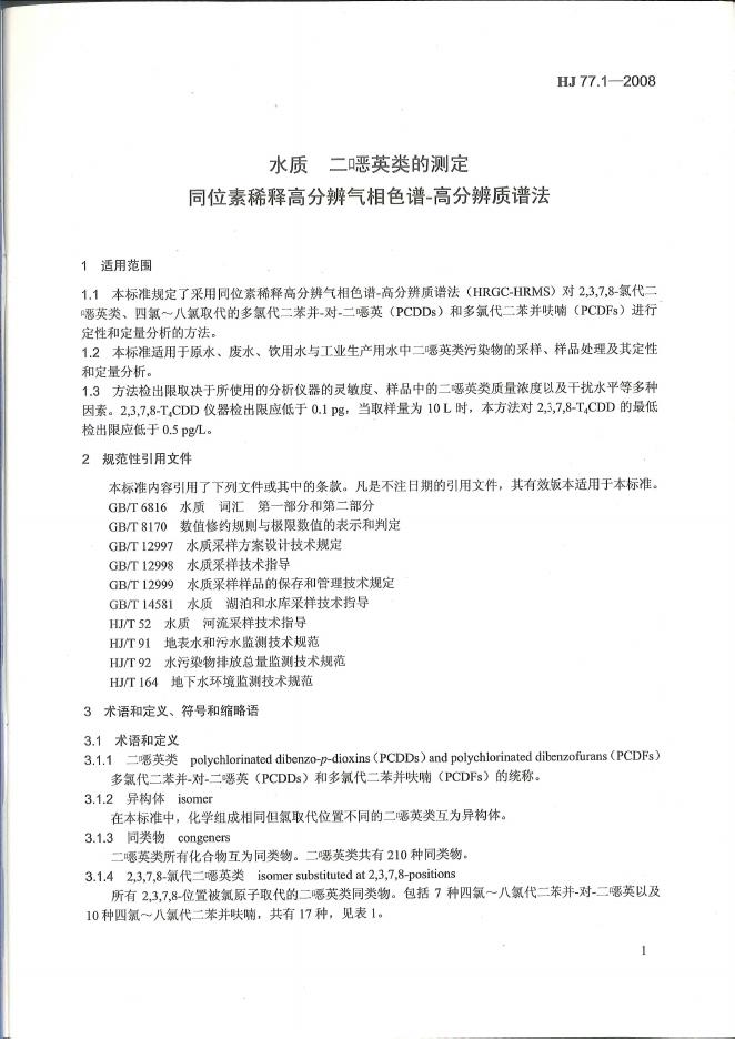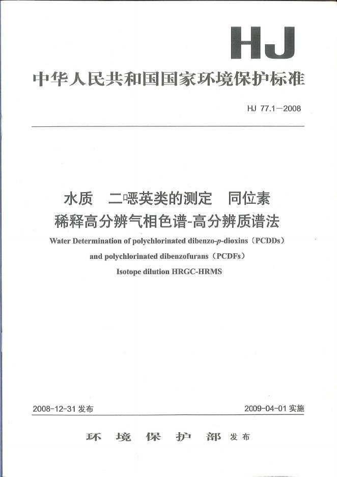 HJ 77.1-2008 水质 二噁英类的测定 同位素稀释高分辨气相色谱-高分辨质谱法