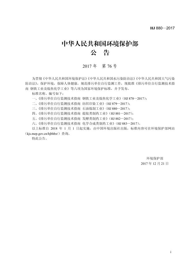 HJ 880-2017 排污单位自行监测技术指南 石油炼制工业