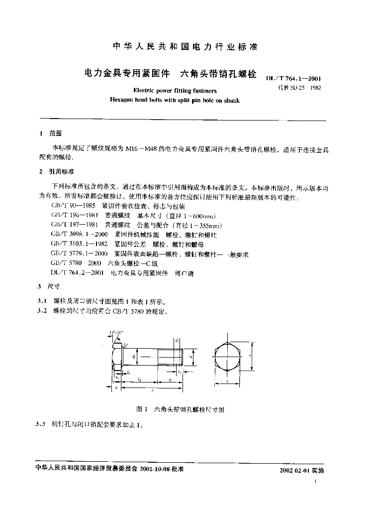 DL/T 764.1-2001 电力金具专用紧固件 六角头带销孔螺栓