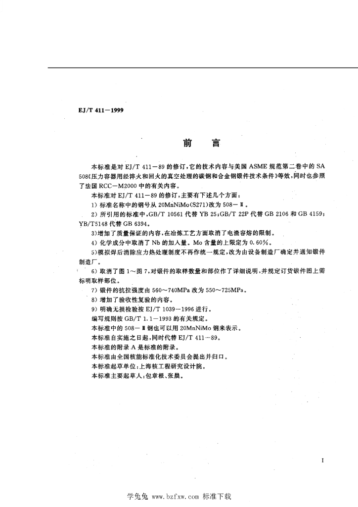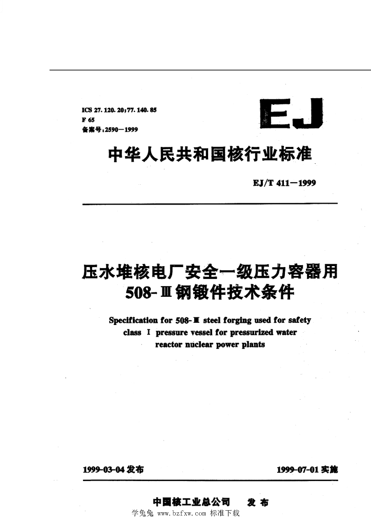 EJ/T 411-1999 压水堆核电厂安全一级压力容器用508-Ⅲ钢锻件技术条件
