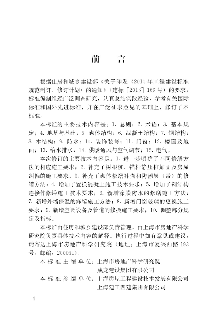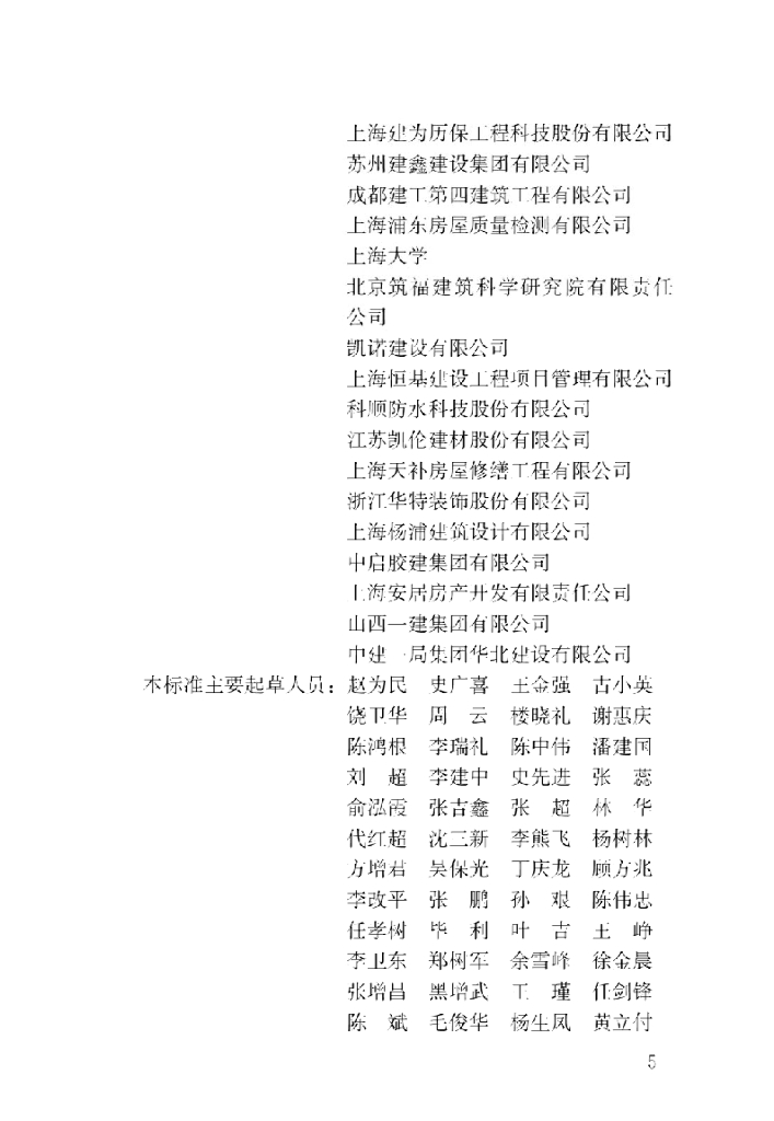 上海市房地产科学研究院、成龙建设集团有限公司、上海房屋工程建设技术发展有限公司、上海建工四建集团有限公司、上海建为历保工程科技股份有限公司、苏州建鑫建设集团有限公司、成都建工第四建筑工程有限公司、上海浦东房屋质量检测有限公司、上海大学、北京筑福建筑科学研究院有限责任公司、凯诺建设有限公司、上海恒基建设工程项目管理有限公司、科顺防水利技股份有限公司、江苏凯伦建材股份有限公司、上海天补房屋修缮工程有限公司、浙江华特装饰股份有限公司、上海杨浦建筑设计有限公司、中启胶建集团有限公司、上海安居房产开发有限责任公司、