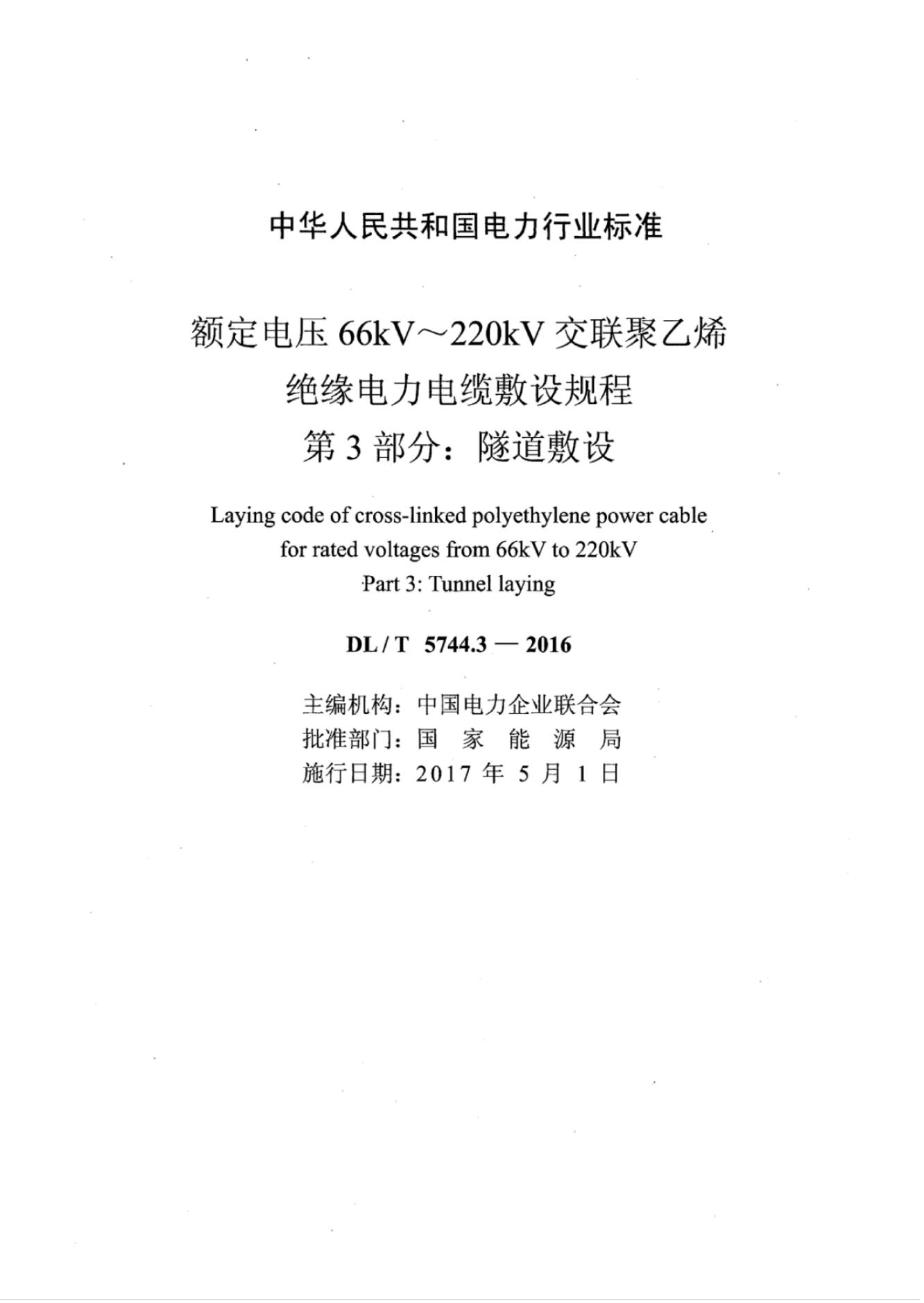 DL/T 5744.3-2016 额定电压66kV~220kV-交联聚乙烯绝缘电力电缆敷设规程 第3部分:隧道敷设