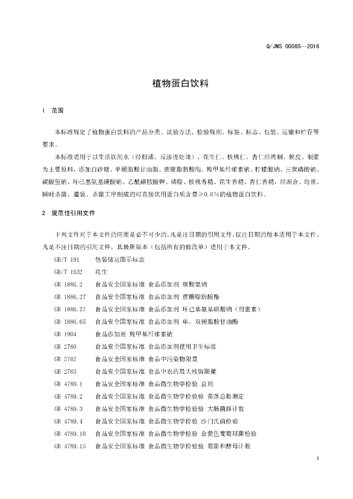 Q/JMS 0008S-2016 焦作市米奇食品饮料有限公司 植物蛋白饮料