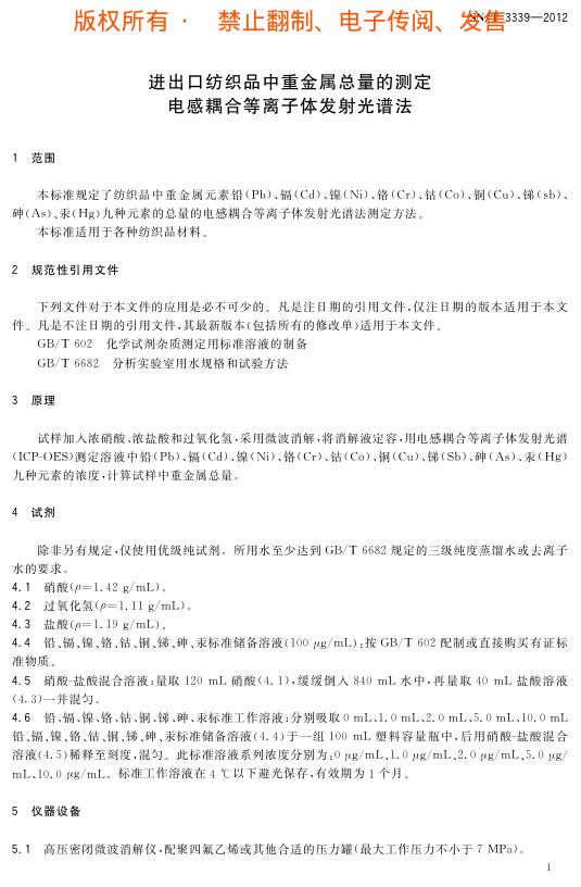 SN/T 3339-2012 进出口纺织品中重金属总量的测定 电感耦合等离子体发射光谱法