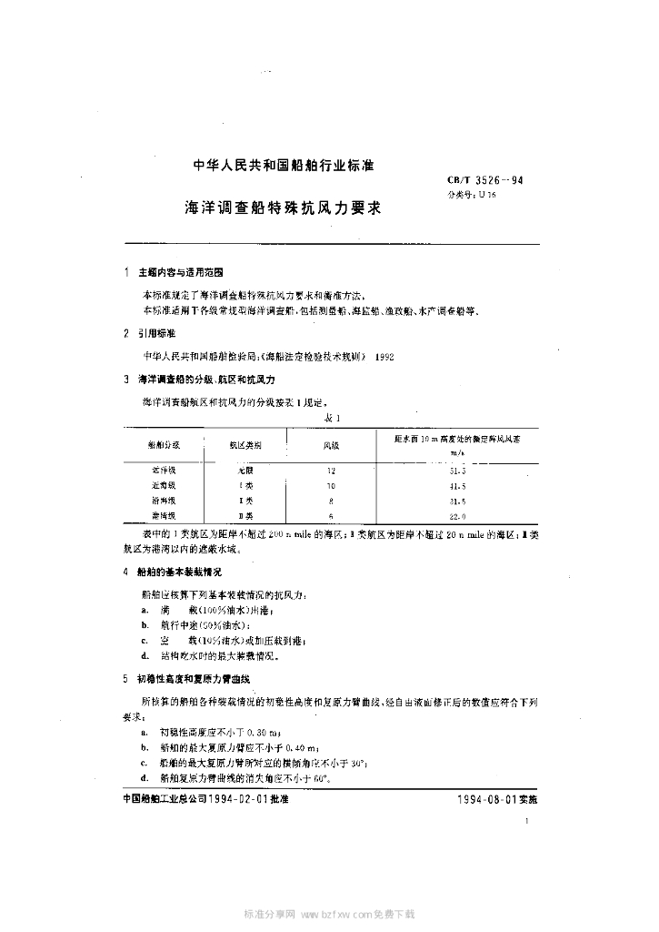 CB/T 3526-1994 海洋调查船特殊抗风力要求