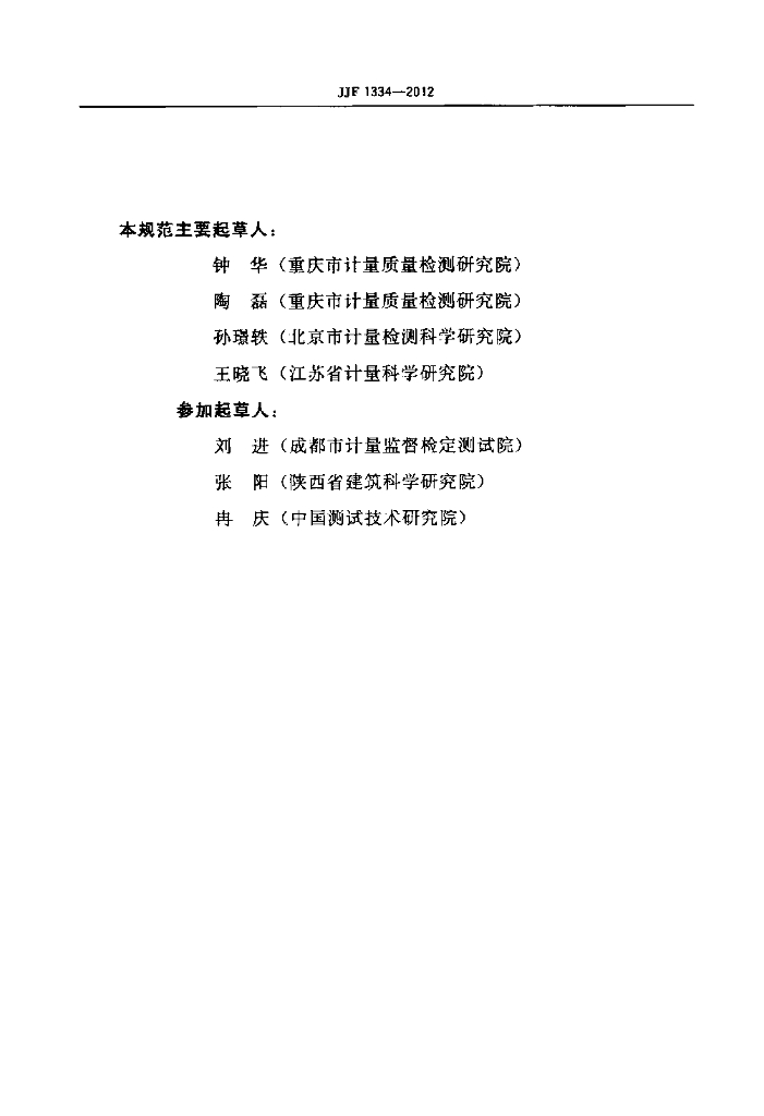钟华(重庆市计量质量检测研究院)、陶磊(重庆市计量质量检测研究院)、孙璟轶(北京市计量检测科学研究院)、王晓飞(江苏省计量科学研究院)、刘进(成都市计量监督检定测试院)、张阳(陕西省建筑科学研究院)、冉庆(中国测试技术研究院)