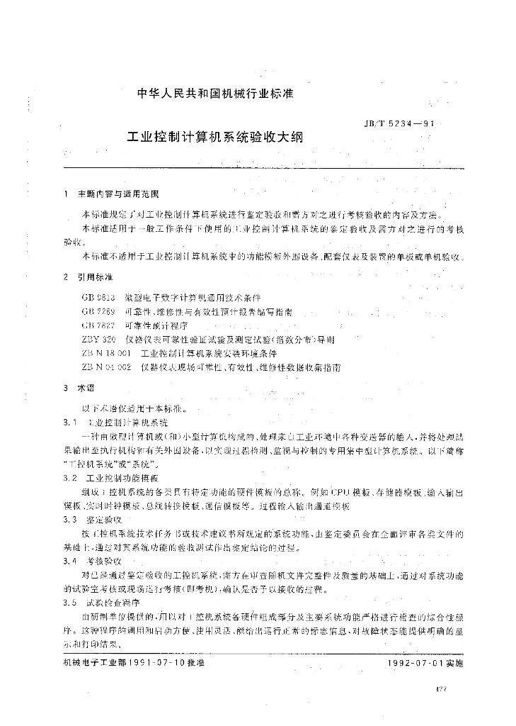 JB/T 5234-1991 工业控制计算机系统验收大纲