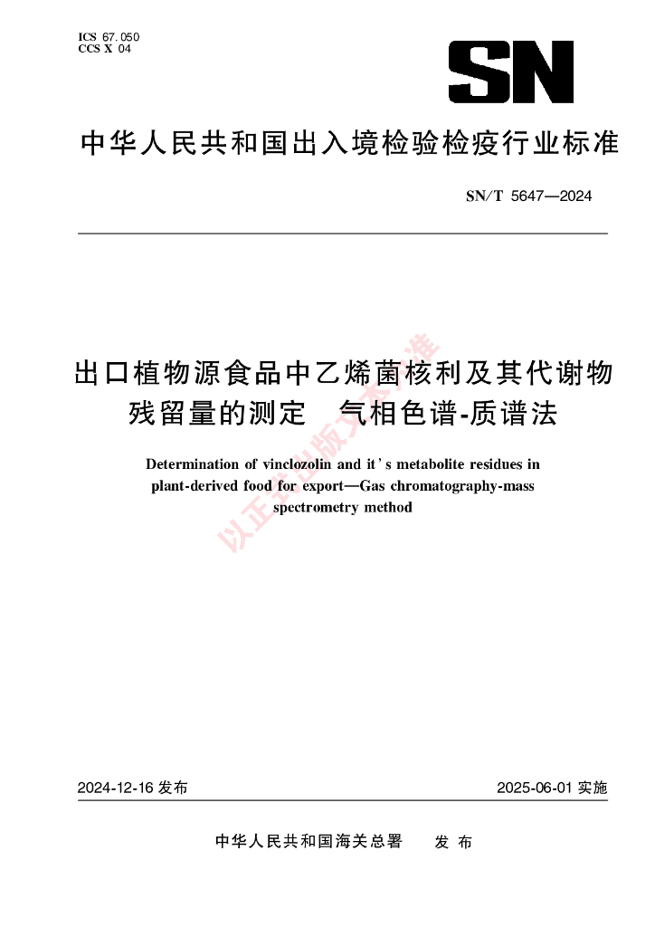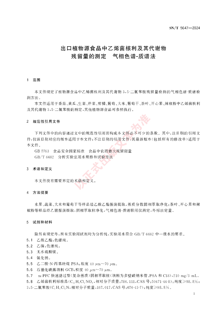 SN/T 5647-2024 出口植物源食品中乙烯菌核利及其代谢物残留量的测定 气相色谱-质谱法
