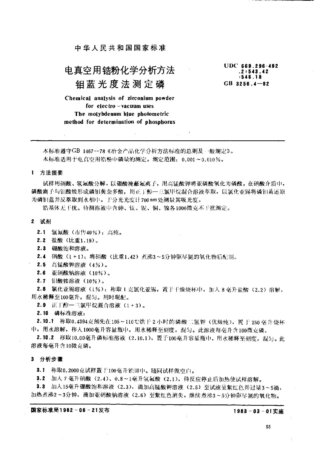 GB/T 3256.4-1982 电真空用锆粉化学分析方法 钼蓝光度法测定磷