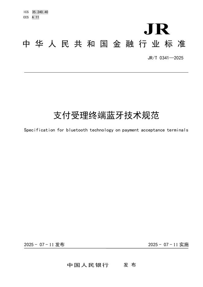 JR/T 0341-2025 支付受理终端蓝牙技术规范