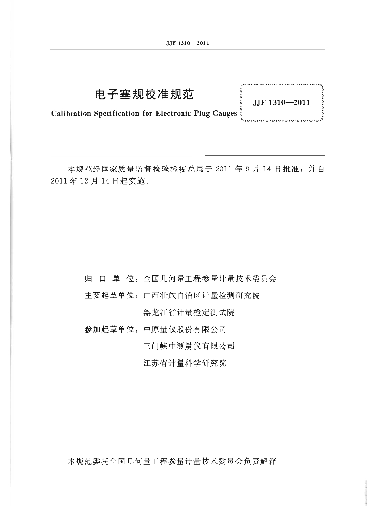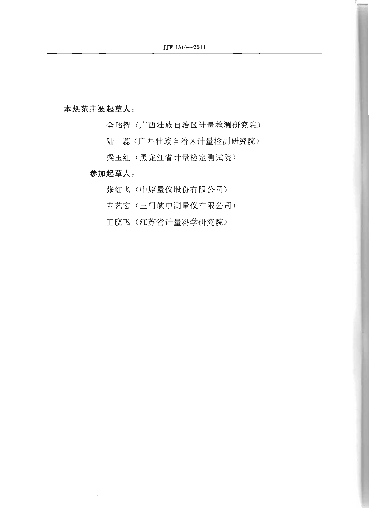 全贻智(广西壮族自治区计量检测研究院)、陆蕊(广西壮族自治区计量检测研究院)、梁玉红(黑龙江省计量检定测试院)、张红飞(中原量仪股份有限公司)、吉艺宏(三门峡中测量仪有限公司)、王晓飞(江苏省计量科学研究院)