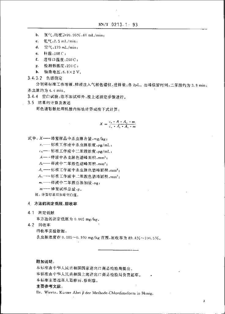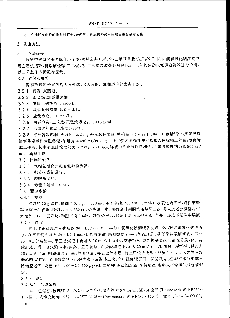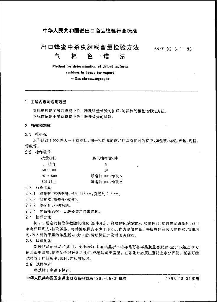 SN/T 0213.1-1993 出口蜂蜜中杀虫脒残留量检验方法 气相色谱法