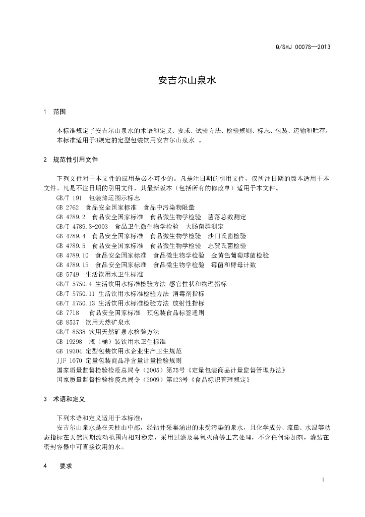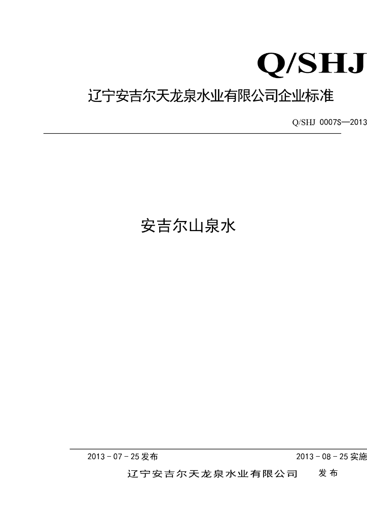 Q/SHJ 0007S-2013 辽宁安吉尔天龙泉水业有限公司 安吉尔山泉水