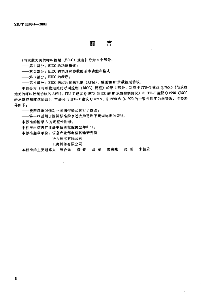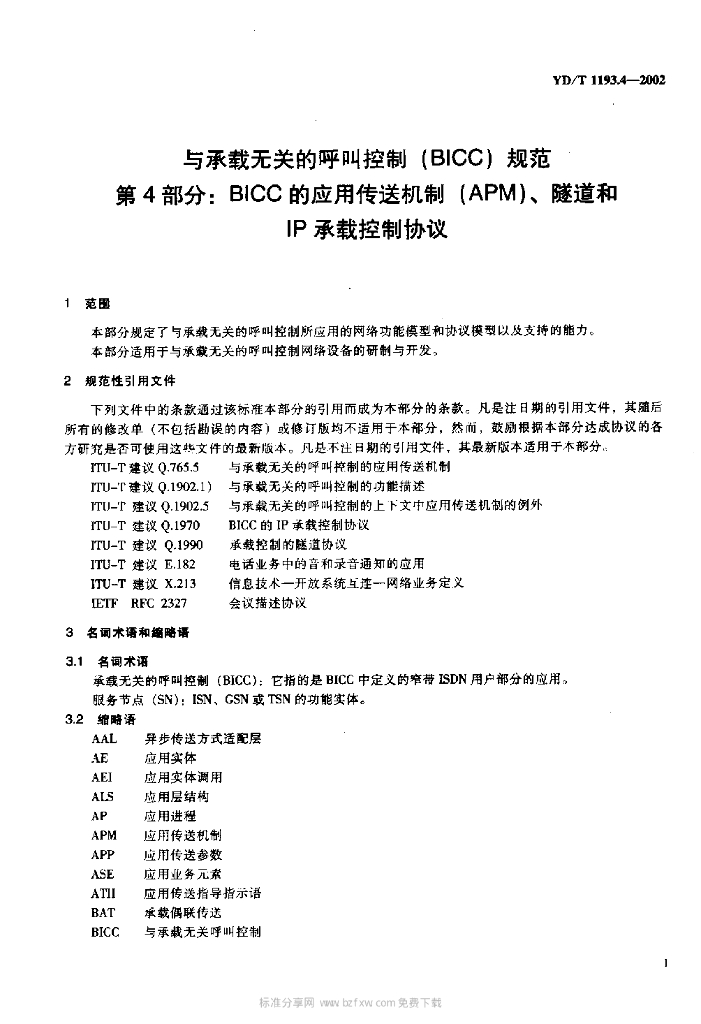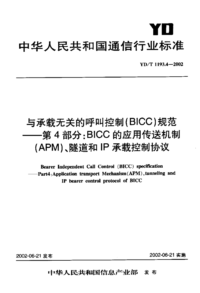 YD/T 1193.4-2002 与承载无关的呼叫控制(BICC)规范 第4部分:BICC 的应用传送机制(APM)、隧道和 IP 承载控制协议