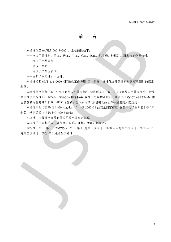 Q/JSLZ 0001S-2022 热凝固畜禽血制品(非即食)