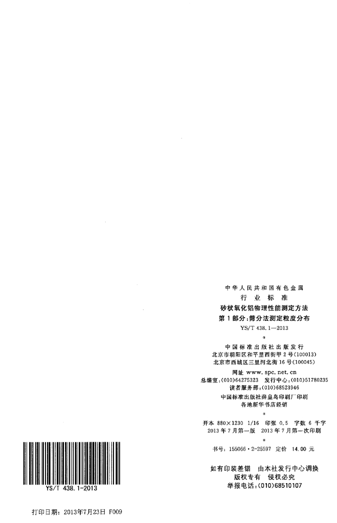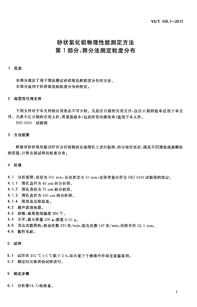 YS/T 438.1-2013 砂状氧化铝物理性能测定方法 第1部分:筛分法测定粒度分布