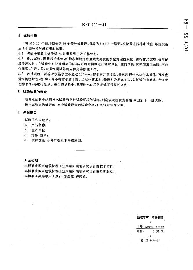 JC/T 551-1994 坐便器低水箱配件排水阀密封及寿命试验方法